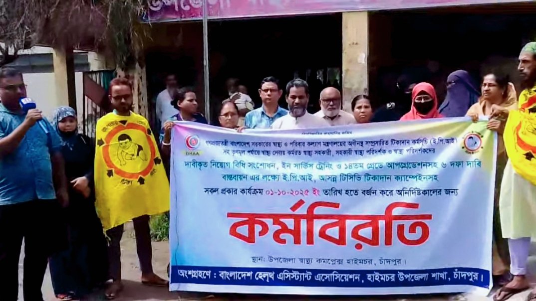 ৬ দফা দাবিতে হাইমচরে স্বাস্থ্য সহকারীদের কর্মবিরতি