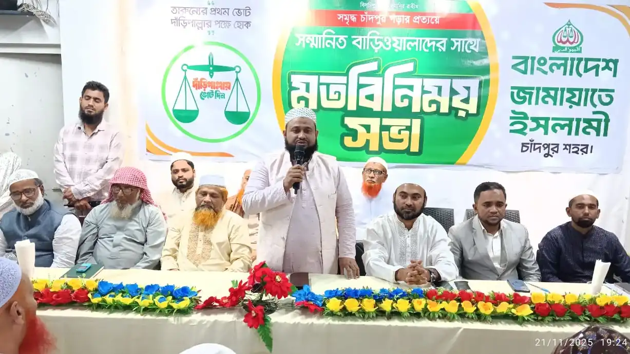 সমৃদ্ধ ও জনবান্ধব চাঁদপুর গড়ার প্রত্যয়ে শহরের বাড়িওয়ালাদের সাথে মতবিনিময় সভা করেছে বাংলাদেশ জামায়াতে ইসলামী চাঁদপুর শহর শাখা। গতকাল শুক্রবার (২১ নভেম্বর) বাদ মাগরিব রেড চিলি রেস্টুরেন্ট অ্যান্ড পার্টি সেন্টারে এ সভা অনুষ্ঠিত হয়।